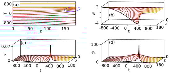 Numerical integration of the coupled system of characteristic ODE (5)–(9): (a) Characteristics for a set of initial conditions . Corresponding evolutions of the momentum (chirp) (b) that exhibits a shock singularity, i.e., a collapse singularity for the corresponding gradient (c), which in turn induces a collapse singularity for the envelope of the incoherent pulse (d) ().