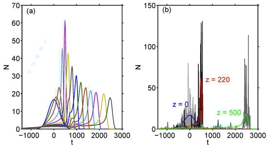 The equations for the characteristics (5)–(9) look similar to those considered in the spatial domain for the propagation of two-dimensional speckle beams []. There is however an important difference with the spatial case: In the temporal case considered here, because of the causality condition inherent to the temporal response function, the derivatives of are not continuous at . This aspect becomes relevant by noting that the whole dynamics is driven by the gradient of the envelope of the incoherent pulse, i.e., the variable in Equation (8). In contrast with the spatial case, the effective potential and its derivatives are not uniformly bounded. As a consequence, the first source term in the equation for takes the general form . Considering the continuity of the response function () [], we can write the evolution of the potential along the characteristic
