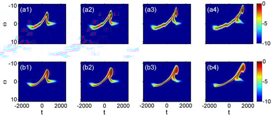 The hydrodynamic model (3) and (4) exhibits a finite ‘time’ singularity (11), which is regularized by the NLS and Vlasov equations (1) and (2)—note that the regularization is not characterized by the formation of rapid DSW oscillations. This is illustrated in Figure 5 and Figure 6 that show the evolution of the incoherent pulse after the shock-collapse singularity. The regularization becomes apparent by remarking that the spectrogram evolves in the two-dimensional phase-space so that its evolution can become ‘multi-valued’, as evidenced in Figure 6. This is in contrast with the function ruled by the hydrodynamic model (3) and (4) that undergoes the shock singularity and which is inherently a single valued function. The derivation of a more complete hydrodynamic-like model describing the regularization of the shock-collapse singularity is a difficult task related to a long-standing mathematical problem, namely achieving a closure of the infinite hierarchy of equations that govern the evolutions of -moments in transport kinetic equations [,]. It is important to note in this respect that the wave-turbulence closure is usually justified in the weakly non-linear regime [,,,] leading to the celebrated (Boltzmann-like) kinetic equation for optical waves [], which describes important phenomena such as light thermalization [,,,,,], wave condensation [], or the dynamics of certain fiber lasers [,,,]. On the other hand, the closure of moments equations considered here concerns the opposite strongly non-linear regime. This problem of regularization was discussed in [] through the analysis of higher-order truncations of the hierarchy of moments equations. The analysis revealed that higher-order -moments become all of the same order of magnitude nearby the singularity (11), which prevents a closure of the hierarchy and thus a reduced description of the dynamics beyond the shock-collapse point.