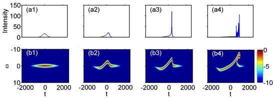 The spectrogram dynamics can be described by means of singular solutions of the Vlasov equation [,], —note that the presence of the Dirac function reflects the narrowness of the spectrum evolving in the strongly non-linear regime. The function can be interpreted as a ‘momentum per particle’, a feature that becomes apparent by remarking that , where the momentum density is defined by . This leads to the following hydrodynamic-like model governing the evolutions of the intensity envelope , and momentum , of the incoherent pulse: