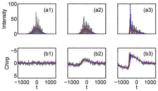 Anomalous dispersion regime: Numerical simulations of the NLS equation (1) (gray line), of the Vlasov Equation (2) (red line), and of the hydrodynamic-like Equations (3) and (4) (blue line). In analogy with the normal dispersion regime (Figure 1), the evolution of the intensity of the field develops a collapse singularity (a), while the momentum (chirp) develops a shock singularity (b). The good agreement between the different models is obtained without using adjustable parameters. Parameters are: , , with the propagation lengths from left to right.