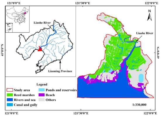 The Liaohe estuarine wetland is located in Panjin City, Liaoning Province, China, the southernmost tip of the Liaohe delta, covering the range of 121°30′~122°00′ E, 40°41′~41°10′ N, with a total area of about 577.69 km2 and a coastline of 118 km. It is the largest wetland nature reserve in China (Figure 1). It is mainly composed of reed marshes, intertidal mudflats, and waters. In this wetland, animal resources are mainly the wild-animal population of migratory waterfowl. In recent years, this wetland has suffered different degrees of destruction due to oil exploration, tourism development, and population growth.