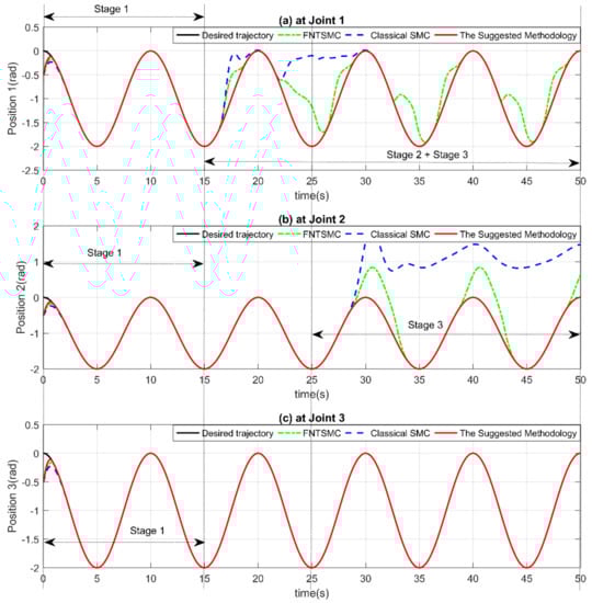 The trajectory tracking performances, including tracking positions and tracking errors at each of the first three joints with three controllers, are illustrated in Figure 3 and Figure 4. In Stage 1 (from 0 s to 15 s), three of the control systems give similar good path tracking performance. In Stage 2 (from time greater than 15 s) and in Stage 3 (from time greater than 25 s), it is clear that the classical SMC provides the poorest path tracking performance, where robot operation becomes unstable when a large disturbance or uncertainty is applied. From Table 2 and Figure 4, it is observed that NFTSMC provides less path tracking error and faster transient response than classical SMC. However, tracking performance is also diminished upon application of a large disturbance. It is noteworthy that the proposed sliding surface is designed based on the sliding function integral in Equation (8), and this integral portion has a significant role in providing fast transient response and robustness against uncertainty and disturbances. Therefore. the proposed control strategy gives the best path tracking performance and fastest transient response among the compared control strategies, due to the role of the proposed surfaces, an adaptive compensator, and a main contribution of the proposed controller.