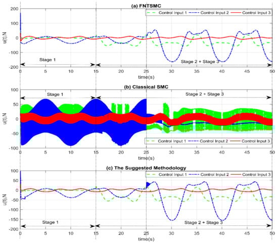 Control input signals: (a) FNTSMC, (b) classical SMC, and (c) the suggested control methodology. FNTSMC = fast nonsingular terminal sliding mode control.