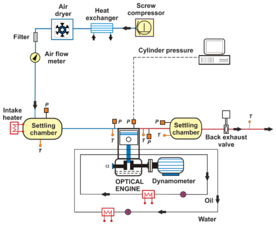 The optical engine was installed in an instrumented test cell containing all facilities needed for the operation, control, and acquisition data of the engine. Figure 1 shows the test cell setup. The intake air flow was supplied by a screw compressor. Temperature and air humidity were controlled by a heat exchanger and a dryer. Just before the air entered inside the cylinder, there was a heater controlled by a PID, which provided a constant intake air temperature.