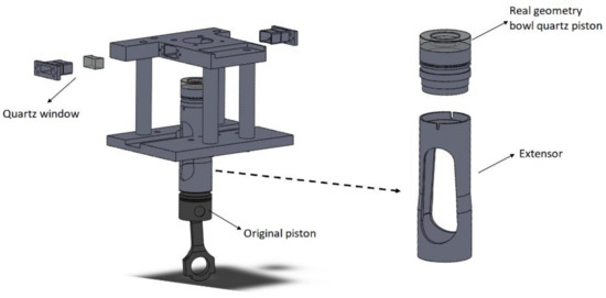 Thermodynamic analysis can be performed either by in-cylinder pressure measurements through rate of heat release (RoHR) calculations or predictive models that provide an estimation of the pressure and temperature evolution inside the chamber for each operating condition [11,12]. This kind of analysis is directly affected by some uncertainties such as the effective compression ratio, heat transfer coefficient, top dead center (TDC) position, etc. Thus, it is necessary to minimize errors, and for this purpose, different methodologies have been carried out to more accurately estimate these parameters [13,14]. However, when dealing with optical engines, it is more difficult to estimate these uncertainties due mainly to differences in heat transfer and mechanical deformations. Differences in heat transfer are basically caused by the optical access and this is related to the lower heat conductivity of quartz in comparison with aluminum and steel. Mechanical deformations occur in several parts of the engine but they are mainly related to the elongated piston caused by the high values of in-cylinder pressure, thermal expansion, and to a lesser extent, the acceleration due to piston movement.