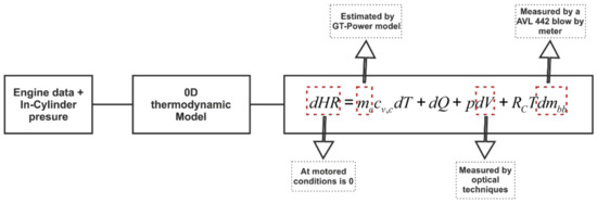 For this purpose, some parameters present in Figure 4 were set as model inputs. These parameters were either estimated by other theoretical tools (1D GT-Power) or measured directly in the engine during the tests. The model and tools will be detailed in the following paragraphs.