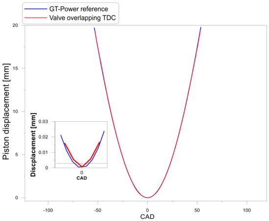 To verify that the measured piston position was correct, a comparison was performed between the measured trace at valve overlap TDC and the calculated trace from GT-Power. We used a correction factor of 11% to the measured displacement curve because the grid paper and piston were in different planes, inducing a perspective error in the transformation from pixels to millimeters. In Figure 8, a good fit can be seen between the piston displacement trace calculated from GT-Power (without deformation) and the measured one at valve overlap TCD (which was used during the study as the reference without deformation.)