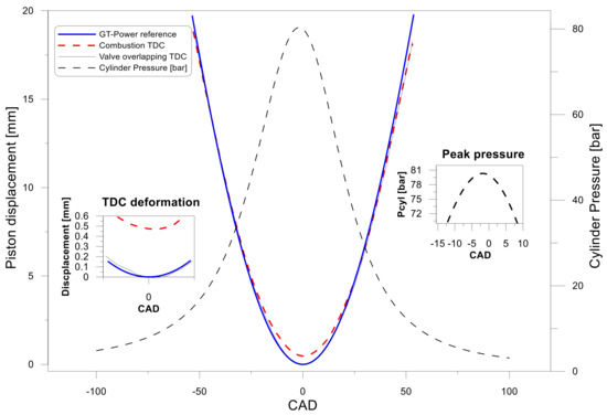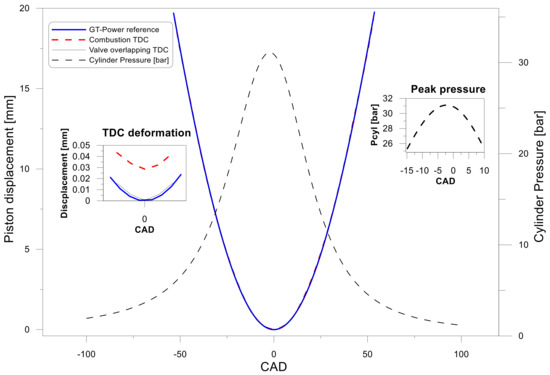 Even though the measured piston position trace was developed from −50 aTDC to 50 aTDC for both TDC in the cycle, the instantaneous volume curve was calculated quantifying only the maximum deformation at firing TDC. This takes into account that the impact of mechanical deformation near the TDC is more significant in the volume change because the volume is the smallest and the deformation is the largest. It is a good approximation to assume that the deformation at the TDC can be scaled with the forces during the rest of the cycle. In the case of this study, these forces come from in-cylinder pressure.