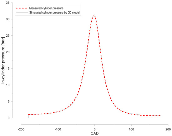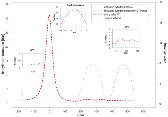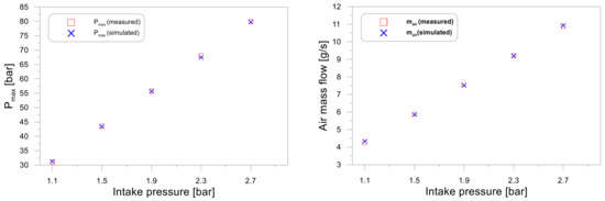 The model was adjusted for each condition considered by verifying some of the measured parameters such as the maximum cylinder pressure (pcyl_max) and air mass flow rate (air). The difference between the simulated and measured results was lower than 5%. Furthermore, for every in-cylinder pressure trace, the best fit between the measured and simulated data mainly was calculated in the low pressure (pumping) part of the cycle.
