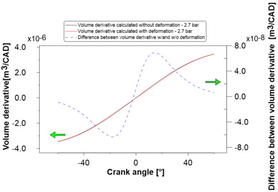 The volume derivative is also of interest because it directly affects both the heat release rate calculation as well as the IMEP calculation. Figure 14 shows the volume derivative with and without deformation as well as the difference between the two derivative volumes at an intake pressure of 2.7 bar. The biggest difference between the curves occurred from −20° to 20° aTDC.