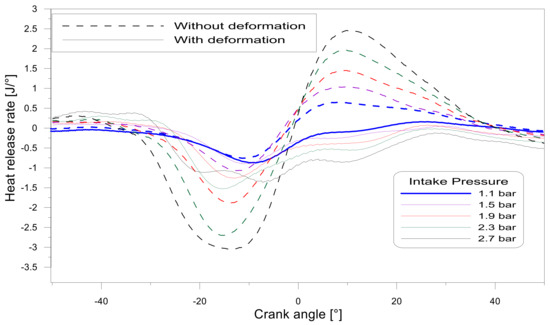 Figure 15 shows the impact of the volume change in the heat release rate trace. It is known that the heat release rate in motored conditions is zero. However, some residuals in the trace are inevitable and the main idea is to try to reduce these residuals as much as possible. It is clear that the RoHR trace for the adjusted instantaneous volume was more accurate and realistic as the solid curves were closer to zero. On the other hand, the dashed curves deviation from zero increased as the intake pressure increased, indicating that there were larger errors in the RoHR calculation. The RoHR shape for the dashed lines was very similar to the difference in the volume derivative shown above. These results present good agreement with the results found in the previous study developed by Aronsson et al. [18].