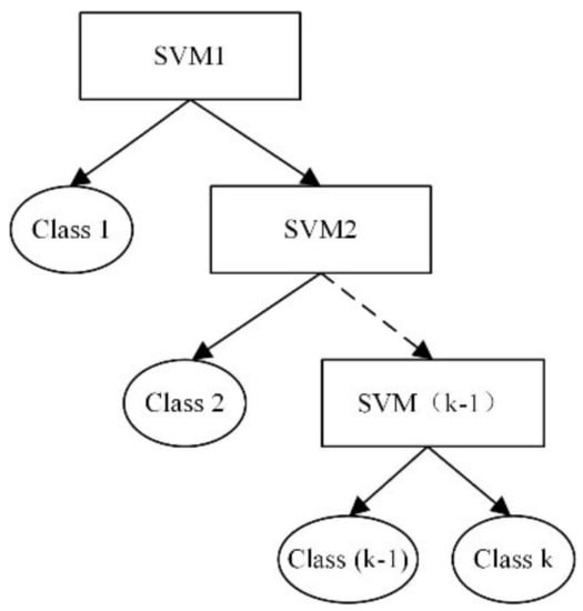 Figure 3 illustrates the conventional Skewness Decision Tree SVM for a k-class classification problem. The classification order is determined by the class label sort. First, class 1 is separated from classes1, 2, 3, …, k. Then, class 2 is separated from classes 2, 3, …, k. Finally, class k − 1 is separated from classes k − 1, k.