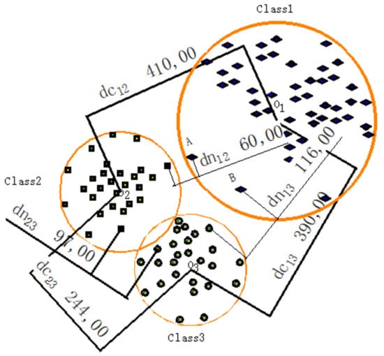 Assuming there are three types of sample signals, one of which has two interference points for points A and B. The two-dimensional spatial distribution of the three types of sample signals is presented in Figure 4. In Figure 4, dc12 is the Euclidean distance between the center of class 1 and class 2, dc13 is the Euclidean distance between the center of class 1 and class 3, dc23 is the Euclidean distance between the center of class 2 and class 3, dn11 is the Euclidean distance between the nearest sample vector of class 1 and class 2, dn13 is the Euclidean distance between the nearest sample vector of class 1 and class 3 and dn23 is the Euclidean distances between the nearest sample vector of class 2 and class 3.