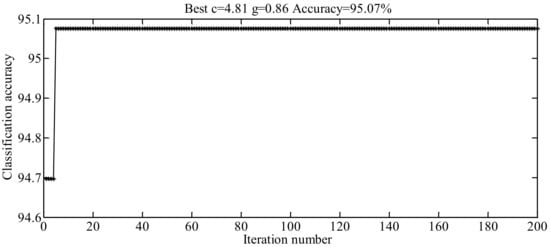 The initial position and speed of the particle are randomly generated. The fitness function is based on a classification accuracy of the ISDTSVM trained with the data subset. In the five-fold cross-validation, the data set is divided into five data subsets. The position and speed of each particle can be updated by the Equation (9). The iteration termination criteria of the PSO algorithm was given by the number of iterations that reached the maximum iteration number.