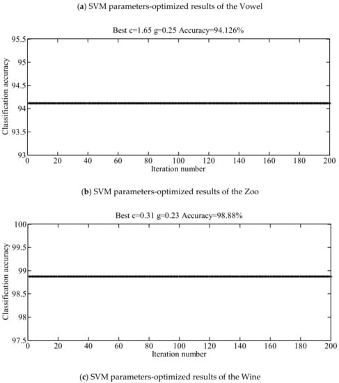 Accuracy of the k-fold cross-validation was taken in to account as a criterion to evaluate the effectiveness of a classification algorithm. The five-fold cross-validation were carried out. The classification testing results of the UCI data sets are presented in Table 2 by using the ISDTSVM algorithm and the conventional SDTSVM algorithm with optimized parameters (Figure 6) and two kinds of kernel functions. As can be observed, for the Vowel, Zoo and Wine data sets, the ISDTSVM algorithm improves the average classification accuracy by 3%, 3% and 1% respectively. The classification accuracy of the radial basis function kernel was higher than the polynomial kernel. The classification results of the Wine data sets are presented in Table 3 using the SDTSVM algorithm with all of the possible classification orders and radial basis function kernel. As can be observed, the determined classification order by the ISDTSVM algorithm has the highest classification accuracy.