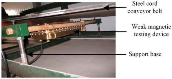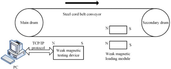 The scheme of the weak magnetic signals collection experiment platform is presented in Figure 8. First, the weak magnetic loading module was installed to magnetize the wire rope in the steel cord conveyor belt. Then, the operating velocity of the belt was 0.5 m/s. The signals were collected by the weak magnetic testing device and transmitted to the upper computer by the TCP/IP protocol, as presented in Figure 9. The main parameters of the weak magnetic testing device were defined. More specifically, the sensitivity of the sensor was 0.5 V/Gs, the sample interval was 0.0005 mm and the data transmission rate was 100 Mbps.