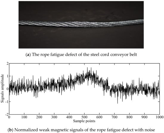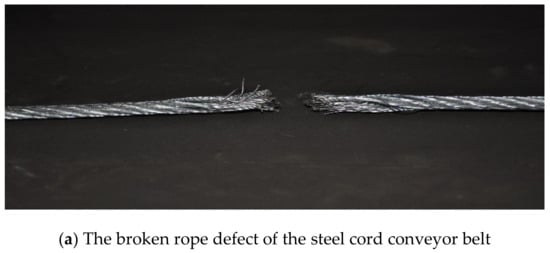 The steel cord belt conveyor is an important transport equipment in modern coal mine transportation. The structure of the steel cord conveyor belt is presented in Figure 1. The main bearing part is the wire rope. Commonly, the steel cord conveyor belt is very long. The vulcanized splice is used for the multi-section connections of the belts. The splices are the weakest parts in the conveyor belt. The steel cord conveyor belt usually suffers from complex loadings and operates under harsh conditions. Therefore, the typical steel cord conveyor belt defects (e.g. splice twitch, broken rope and rope fatigue) are induced leading to the strength reduction of the conveyor belt. The fracture failure of the steel cord conveyor belt could be caused if the defects had not been classified timely. The fracture presented in Figure 2 illustrates the consequence of such a failure. The belt fracture will not only cause huge economic losses, but also even causes casualties [1,2]. Therefore, it is imperative to develop more accurate methods for the classification of steel cord conveyor belt defects, which significantly contributes to prevent fracture accidents.
