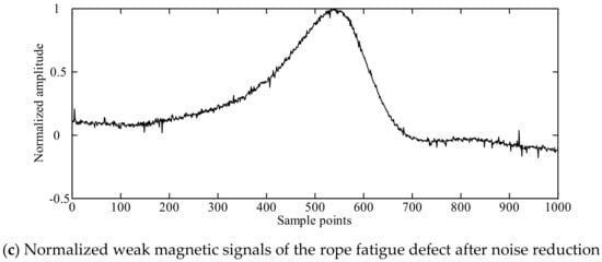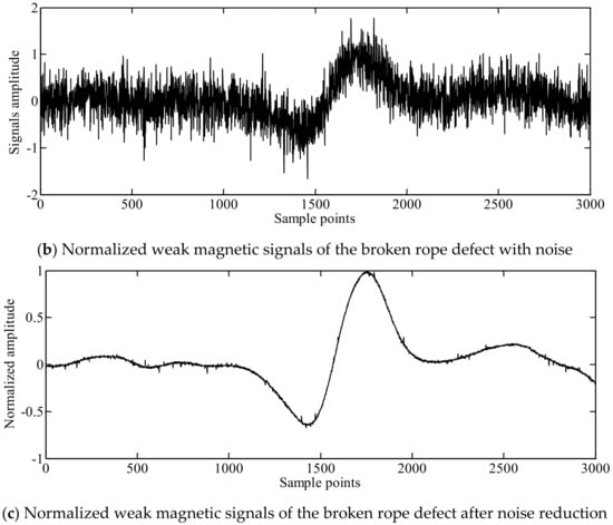 In order to eliminate the effect of the signals amplitude on classification, the signals after noise reduction were normalized. The normalized signals of the splice, the broken rope defect and the rope fatigue defect before and after noise reduction are presented in Figure 11, Figure 12 and Figure 13.
