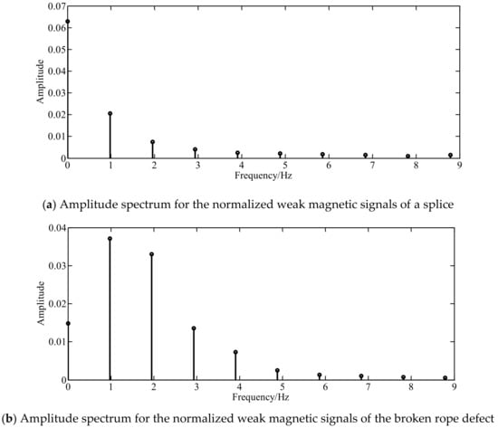 Amplitude spectrum for the weak magnetic signals of the steel cord conveyor belt defects.