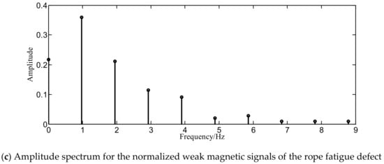 The frequency domain and time domain features of the weak magnetic signals of the steel cord conveyor belt defects were extracted. The spectral amplitudes corresponding to the different defects are presented in Figure 14. The peaks are observed at similar frequencies, with slight discrepancies at the amplitude. Therefore, the time domain features are selected for the classification.