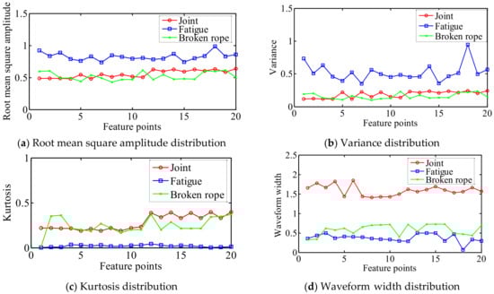 First, twelve common time domain fault features were extracted, which were the peak-to-peak values, root mean square amplitudes, mean amplitudes, variance, root amplitudes, waveform width, kurtosis, wave index, peak index, pulse index, margin index and the kurtosis index. Then, the features were reduced by a neighborhood rough set algorithm. The four time domain features, after reduction were root mean square amplitudes, variance, kurtosis and waveform width. The root mean square amplitudes mainly reflected the signals energy, the variance mainly reflected the degree of the signals dispersion and the kurtosis mainly reflected signal sharpness and impact characteristics. As can be observed in Figure 11, Figure 12 and Figure 13, the normalized signal features of the splice, broken rope defect and rope fatigue defect were significantly different in waveform width, signals energy, degree of signals dispersion, signal sharpness and impact, the waveform width and kurtosis of splice signals were usually larger than the broken rope defect and the rope fatigue defect. Therefore, according to the features reduction and waveform analysis in Figure 11, Figure 12 and Figure 13, the four domain features, finally determined, were root mean square amplitude, variance, kurtosis and waveform width.
