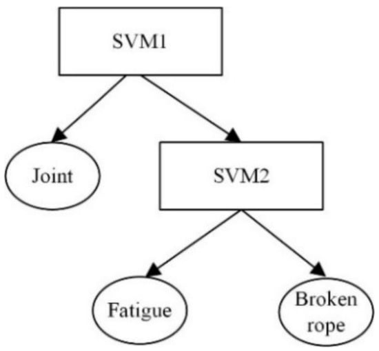 Classification results of the steel cord conveyor belt defects using the ISDTSVM algorithm and the conventional SDTSVM algorithm with different kernel functions and five-fold cross-validation are presented in Table 4. As can be observed, the ISDTSVM algorithm improved the classification accuracy of the steel cord conveyor belt defect signals by 4%. The classification accuracy of the radial basis function kernel was higher than the polynomial kernel. The tree structure was obtained in Figure 17 using the ISDTSVM algorithm. In order to verify the classification effect of the ISDTSVM algorithm, the classification results for the three classification orders of the steel cord conveyor belt defect signals are presented in Table 5 using the SDTSVM algorithm with optimized parameters presented in Figure 16 and were validated by a five-fold cross-validation. As can be observed in Table 5, the classification accuracy of the classification order obtained by the ISDTSVM algorithm was the highest in the three classification orders. The ISDTSVM algorithm significantly improved the classification accuracy.