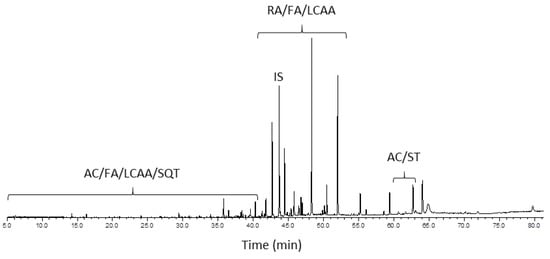 A GC-MS chromatogram of a Pinus pinea bark trimethylsilyl-derivatized dichloromethane extract. Abbreviations: AC, aromatic compounds; FA, fatty acids; IS, internal standard; LCCA, long-chain aliphatic alcohols; RA, resin acids; SQT, sesquiterpenes; ST, sterols.