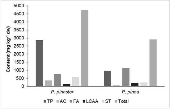 Five major families of lipophilic components were identified and quantified in the lipophilic extracts from the bark of P. pinaster and P. pinea by GC-MS. These were terpenic compounds, aromatic compounds, fatty acids, long-chain aliphatic alcohols (LCAAs), and sterols, as demonstrated in Figure 1 and Figure 2 and detailed in Table 1. The total content of identified compounds varied between 2910 mg kg−1 dw in P. pinea bark and 4746 mg kg−1 dw in P. pinaster bark. Terpenes are the main family present in these extracts, ranging from 965 mg kg−1 dw in P. pinea bark to 2865 mg kg−1 dw in P. pinaster bark, which accounted for 33% and 60% w/w of the total content of identified compounds, respectively.