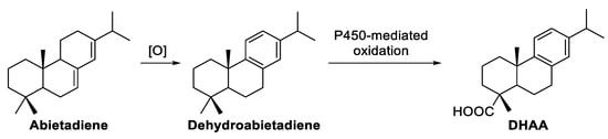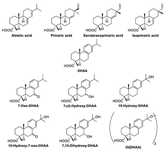 Resin acids (mainly abietane-type resin acids, including the abietic, neoabietic, palustric, and levopimaric acids, and minor amounts of pimarane-type resin acids, including the pimaric, isopimaric, and sandaracopimaric acids) are the major components of Pinus spp. wood resin []. Small amounts of dehydroabietic acid (DHAA), obtained by dehydrogenation of abietane-type resin acids, can also be found in wood resins. These compounds have been exploited as important commodities for the chemical industry []. In addition, they play an important role in the chemical defense of conifers. Many examples show a relationship between conifer diterpenic acid content and a tree’s resistance to potential herbivores and pathogens []. Furthermore, resin acids display important beneficial properties for human health, being the antimicrobial, antiulcer, and cardiovascular activities the most representative ones [,].