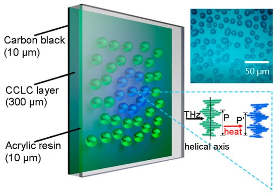 The configuration of the CCLCF is illustrated in Figure 1. It consists of three layers. The CLCs are encapsulated in droplets of ~10 μm in size dispersed in an organic solvent (RM2325, Capsular Products, Tokyo, Japan), shown in the inset of Figure 1, which is directly coated on the acrylic resin layer. The carbon black layer adheres to the CCLC layer from the back side, in order to clearly change the color of the CCLCF. This thin film is flexible and pressure-insensitive, which makes it easy to scale up for operation.