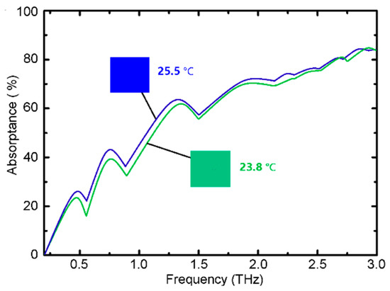 The narrow temperature range of the color change is better for the sensitivity of the THz power measurement. Our thermochromic LC is temperature-supersensitive, which is from about 22 °C to 25.5 °C, as shown in Figure 2, at a room temperature of 23.8 °C, and green light is reflected while the color changes to blue (corresponding to the saturation) when the temperature reaches 25.5 °C, increasing by just 1.7 °C. The inset pictures were taken by a common commercial digital camera and show that the film is very homogeneous. The curves represent the THz absorptance spectra at different temperatures. The absorption A(ω) is calculated by 1 − T(ω) − R(ω), where T(ω) and R(ω) are the transmittance and reflectance of the CCLCF, respectively, measured by conventional THz time-domain spectroscopy. Compared to our earlier work [28], here we improved the sample by removing two layers Polyethylene terephthalate and double-sided tape to obtain a higher THz absorption. We can see that the THz absorption of the CCLCF is almost temperature-independent, where the absorption at 25.5 °C is a little larger than that at 23.8 °C. The THz polarization-independent characteristic is also measured and confirmed, which is not given here. The absorption increases over the entire THz region from 0 to 3 THz. The oscillation in the THz absorptance spectrum is an interference effect caused by multiple reflections of the CCLCF. The thermal conductivity of the sample we measured is about 0.5 J/msK. All the measurements indicate that the device is stable, which is suitable for our THz power detection.