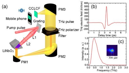 Since we aim to propose a new method to detect THz power using our CLC device, the characterization of its performance in a large power range is more expected. Therefore, the THz pulse generation setup using the titled-pump-pulse-front method [15,16], which is believed to be one of the most efficient THz sources [9,13,16], is adopted in our experiment. We generate THz pulses with pulse energy of 2.6 μJ by using pump beam with pulse energy of 4 mJ. The energy conversion efficiency is thus ~0.7‰. The advantage of our system is that the LiNbO3 has a much higher pump-power tolerance and can generate high intensity THz waves. The much larger pump power compensates for the lack of the energy conversion efficiency. Our mW class THz source (pulse peak amplitude ~500 kV/cm) can be satisfactory for many researches. The setup and the THz power measurement with the CCLCF is shown in Figure 3a. The LiNbO3 crystal is pumped by a regeneratively amplified Ti: sapphire laser (Legend Elite: 800-nm central wavelength, 4-W optical power, 100-fs pulse duration, 1-kHz repetition rate, Coherent) to generate the broadband THz pulse. A black polypropylene filter is used to block the remaining pumped laser and the radiation produced in the crystal along with the terahertz generation. The THz source intensity is tunable by rotating the THz polarizer. The CCLCF (1.5 cm × 2.5 cm) is placed at the focal point. THz radiation is normally incident on the sample. Images and videos are taken by a smartphone camera with wireless Bluetooth technology to make it not only convenient but also to insure the detection position is fixed. The initial temperature of the CCLCF is 23.8 °C. Figure 3b shows the THz temporal profile. Single-cycle THz pulses with amplitudes of about 500 kV/cm are generated by optical rectification from LiNbO3 [29]. Its corresponding THz spectral range is mainly 0–1 THz, which is shown in Figure 3c. The inset indicates that the THz beam spot size obtained with a THz camera (IRV-T0831, NEC, Tokyo, Japan) has a spatial profile of only about 300 μm after focusing by the parabolic mirrors. A commercial pyroelectric detector (THz-5B-MT, Gentec-EO, Quebec City, Canada) was used to calibrate and measure the THz radiation power. The maximum average THz power (Pmax) was 2.6 mW in our system. Thus, the maximum THz power density is as high as 4.0 × 103 mW/cm2. As the focused THz beam size is very small with a high power density, the color change increases in size to a large area in the CCLCF, which can be seen clearly.