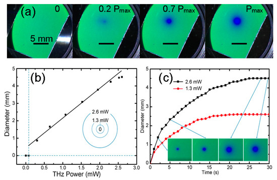 A direct visualization of different THz powers is demonstrated in Figure 4a. The images show an increase in alteration at the same area, suggesting the apparent temperature growth and thermal diffusion due to the increase in THz intensity. Without THz radiation, the green background color is a reference. Just two colors are involved, which is beneficial for our image analysis. For simple use, here we choose the diameter of the color change area as an evaluating parameter. Through the processing of our CCLCF images and videos based on hue, since hue increases monotonically with an increase in temperature [28], related parameters and data can be obtained by using software ImageJ [30]. The digital value of hue is 131. Figure 4b presents the relationship between the diameter and THz power in the steady state. The detectable THz field threshold value is about 0.07 mW, which can produce color changes visible to the naked eye. It has an approximately linear relationship above the threshold. The film still works well even when the THz intensity exceeds 4.0 × 103 mW/cm2. Therefore, we quantify the THz wave intensity by the diameter of the color change of the CCLCF. The increasing diameter looks similar to a target, which suggests an apparent temperature growth due to the increase in THz intensity. The response time is shown in Figure 4c. We can see that the CCLCF clearly has different responses with different THz powers. The entire system has corresponding images in thermodynamic equilibrium with different THz powers. With the high THz power, thermal diffusion is faster than that at low power, but the stabilization diameter is much larger, thus, the response time is slow. As can be seen, at the THz power maximum of 2.6 mW in our system, it takes about 30 sec to reach equilibrium, while at 1.3 mW, the stabilization time is about 15 sec. The images from the video captured by the camera under 2.6 mW at radiation times of 2, 5, 28, and 30 sec shown in the inset demonstrate how the diameter increases with time.
