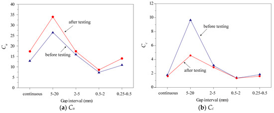 Figure 4 presents the changes of non-uniform coefficients Cu () and coefficients of curvature Cc () of the SRMs before and after the tests at different gap intervals. It is seen that after vibrating compaction, Cu increases, while Cc decreases, especially in the absence of particles within 5–20 mm. This means the SRM gradations have changed during the vibrating compaction, resulting from the particle breakage that will be discussed later.