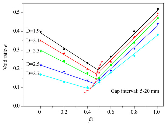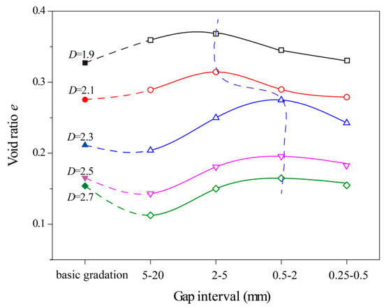 Figure 5 gives the changes of the void ratios of the SRMs with gap intervals under the basic gradations with different fractal dimension D. It can be seen that the changing trend of the curves is similar when D = 2.3, 2.5 and 2.7 (as shown in Figure 3), but it is different from that of D = 1.9 and 2.1. From the definition of D in Equation (1), the particle size in an assembly increases with the decreasing D. When D = 1.9 and 2.1, the particles within 5–20 mm may act as filling components in SRMs. The absence of these particles leads to insufficient filling of the voids among the skeleton particles, resulting in the bigger void ratios of the SRMs than those of the basic gradations when D = 1.9 and 2.1. Figure 5 also demonstrates that there are the vital grain size groups acting as filling components in SRMs. The vital grain size group is 0.5–2 mm when D = 2.3, 2.5, 2.7 and it is 2–5 mm when D = 1.9, 2.1. The absence of the vital grain size group will significantly increase the void ratio of the SRM, which should be taken seriously in engineering practice.
