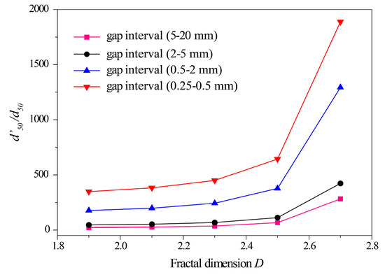 Changes of d’50/d50 with fractal dimension D at different gap intervals.