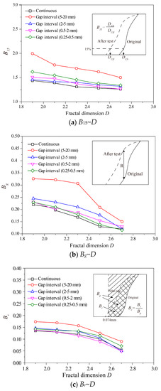 As aforementioned, particle breakage will inevitably happen during the vibrating compaction on SRMs. Commonly, the degree of particle breakage is quantitatively evaluated using three indices: B15 [27], Bg [28] and Br [29], where B15 is the ratio of the diameter before test and after test corresponding to 15% finer passing in the gradation curve; Bg is the maximum distance between the original gradation curve and gradation curve after test; Br is the ratio of Bt to Bp, where Bt is the area between original gradation curves and gradation curve after test, Bp is area between original gradation curve and the line d = 0.074 mm. Figure 7 shows the particle breakage of SRMs with gap intervals under the basic gradations with different fractal dimension D. The test results demonstrate that the particle breakage of gap-graded SRMs is more prominent than the SRM with continuous gradation on the whole, especially at the gap interval of 5–20 mm. The degree of particle breakage decreases gradually with the increasing fractal dimension D of the basic gradation. This is because the particle sizes in SRM decrease with the increasing D, and consequently less particle breakage will happen during the vibrating compaction.
