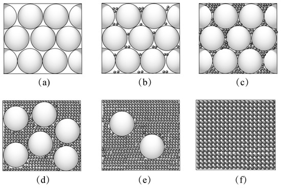 The relationship is approximately bilinear, and the turning point corresponds to the minimum void ratio of the SRM, which can be explained with the help of Figure 9. Figure 9a illustrates coarse-grained particles enclosing a void space in the case of fc = 0. When fc increases gradually, the fine-grained particles enter into the voids as filling components, leading to the decrease of the void ratio of the SRM (Figure 9b). Figure 9c shows the state when all voids are fully occupied by the fine-grained particles and the minimum void ratio of the SRM is achieved. The corresponding fc is called the optimal mass contents of the fine-grained group. If fc continues to increase, coarse-grained particles will be separated by the fine-grained particles and “float” in the matrix of fine-grained particles, as shown in Figure 9d,e, resulting in the increase of the void ratio of the SRM. As fc increases up to 1.0, the coarse-grained particles disappear and only fine-grained particles exist in the mixture (Figure 9f), where the maximum void ratio is reached.
