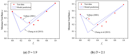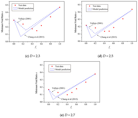 For a given mass content in fine-grained group fc, two values of minimum void ratio eM can be calculated: One is from Equation (14), the other is from Equation (15). The greater of the two void ratio values is likely to be achieved, because it requires less energy to reach the state. Therefore, the greater of the two values is considered to be the solution.