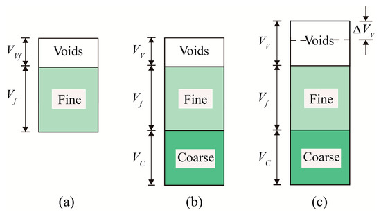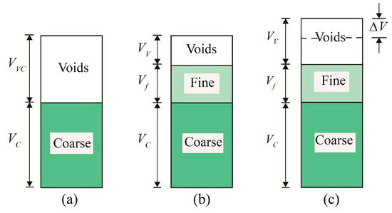 Firstly, we consider the coarse-grained particles as the dominant materials. The phase diagram of pure coarse-grained particles is shown in Figure 12a. The solid volume of coarse particles is Vc, and the void among coarse-grained particles is Vvc. Then, as shown in Figure 12b, fine-grained particles are added into the pure coarse-grained particles. In a limiting case, all the added fine-grained particles fill into the voids among coarse-grained particles without altering the structure of coarse-grained particles. Therefore, the solid volume of fine particles (Vf) occupies a space in the void volume (Vvc) and the total volume remains constant. However, as stated above, the limiting case can hardly be achieved, and the total void volume will change due to the particle breakage and altering of the structure of coarse-grained particles. The change of total volume is ΔV, and it is caused by two parts, one is caused by the altering of the structure of coarse-grained particles ΔVA, the other is caused by particle breakage ΔVB, ΔV = ΔVA + ΔVB.