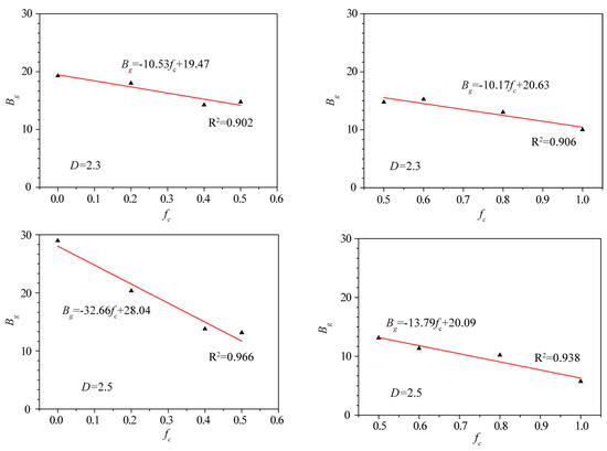 (2) Calculation of ΔVB: The data of particle breakage index Bg, which is measured in the compaction tests, is plotted versus fc in Figure 13. The particle breakage index Bg is found to be linearly related to fc. Here, we only show the cases of D = 2.3 and 2.5 for the limitation of the paper length. Therefore, Bg can be represented with Equation (6):