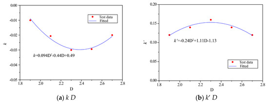 The model for estimating minimum void ratio of gap-graded SRM employs 4 parameters, that is, ec, ef, k and k’. ec and ef are the void ratio of pure coarse-grain particles and pure fine-grained particles, which can be easily obtained by conducting the compaction tests on pure coarse-grained and fine-grained particles. k and k’ are material constants. Data of k and k’ are plotted versus fractal dimension D of basic gradation in Figure 16. It can be found that the relationship between k, k’ and D can be well fitted by a quadratic polynomial function, which is given by . A, B and C are material constants irrespective of gap intervals. Therefore, if the parameters of D, ec, ef of a gap-graded SRM are given, we only need to conduct compaction tests of one gap interval to obtain the parameters of ec, ef, A, B, C, and we can predict the minimum void ratio of gap-graded SRM with other gap-intervals. It is noted that we can obtain the parameters k and k’ by conducting some compaction tests if the gradation information is not given.