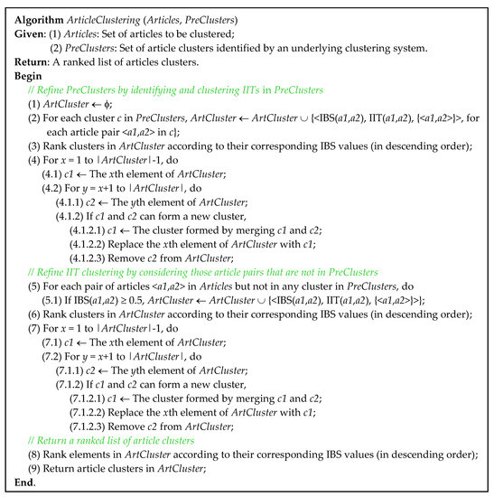 As an IIT between two articles contains those terms that indicate the shared issue of the two articles, issue-based clustering of articles can be done by clustering the IITs. Therefore, with IBS and IIT defined for any two articles (ref. Equations (8) and (14) defined above), ICRT conducts issue-based clustering of articles by clustering the IITs (ref. Figure 2c noted above). ICRT is designed to work as a post-processor of existing clustering systems, which provides clustering results to be refined by ICRT. The algorithm is outlined in Figure 3.