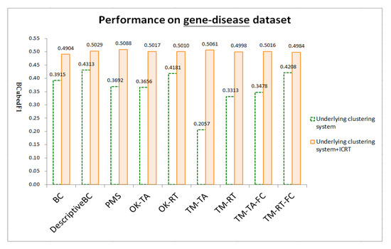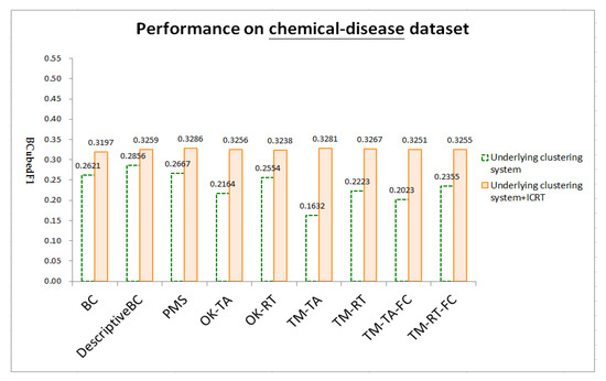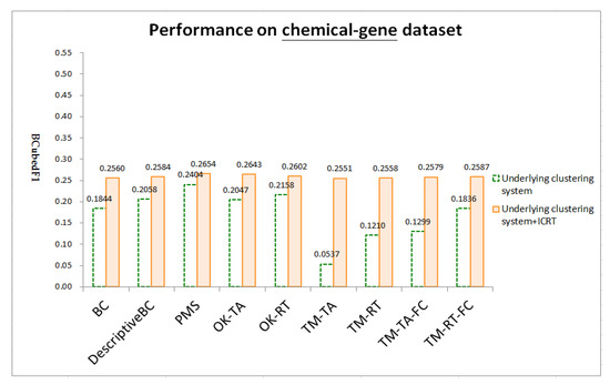 Figure 4, Figure 5 and Figure 6 respectively show test results on three datasets: chemical-gene, chemical-disease, and gene-disease datasets defined above (ref. Section 4.1). ICRT successfully works as a post-processor to improve all the underling systems in all the datasets. It is interesting to note that, with the help of ICRT, all the systems achieve similar performance on individual datasets, indicating that ICRT can work with various clustering systems to conduct issue-based clustering. Among the three datasets, these systems achieve worse performance on the chemical-gene dataset (compare BCubedF1 values in Figure 4, Figure 5 and Figure 6). As noted in Section 4.1, in this dataset, many articles belong to more clusters (about 50% of the articles belong to three or more clusters, ref. “# articles belonging to X clusters” of the first dataset in Table 1), making it more difficult to identify appropriate clusters. Overlapping clustering of the articles is thus an essential and challenging task.