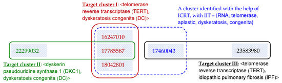With the help of ICRT, all systems correctly identify Target cluster II, but not Target cluster I, as they make an error in identifying a large cluster with an additional article (ID = 17460043, see the cluster marked with a dash line box in Figure 7). This article focuses on the association <TERT, IPF>, where IPF is “Idiopathic Pulmonary Fibrosis” (see Target cluster III in Figure 7). That is, both Target clusters I and III are about a gene TERT, but they are about different issues of entity associations (i.e., associations between TERT and two different diseases DC and IPF, respectively). Detailed analysis shows that the error is made (i.e., grouping article 17460043 into Target cluster I) for two reasons: (1) when discussing the target issue <TERT, IPF>, article 17460043 also discusses <TERT, DC> and cites references about the association, and (2) the article also notes the correlation of DC and IPF, and cites references about the correlation. That is, the article discusses correlations among TERT, DC and IPF, although it manly focuses on TERT and IPF only.