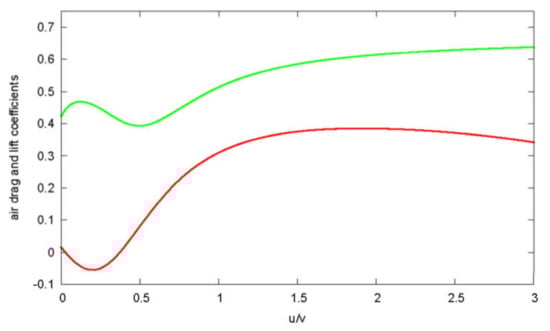 Air drag coefficient CD (upper green curve) and airlift coefficient CL (lower red curve) as a function of the ratio of spinning velocity u to the translational velocity v.