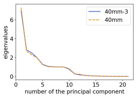 Eigenvalues as a function of each principal component for the databases of the 40-mm ball and the 40-mm ball with 3-cm-higher net.