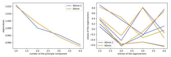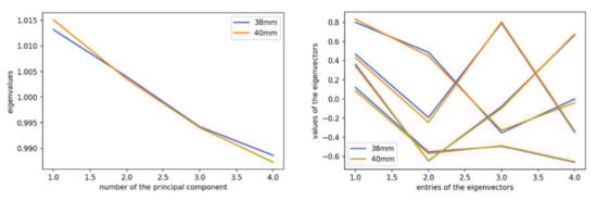 (left) Eigenvalues as a function of each principal component for the databases of the 38-mm ball and the 40-mm ball. (right) Values of the eigenvectors for the two cases.