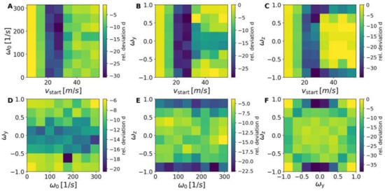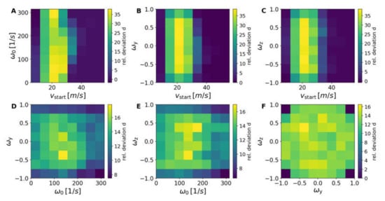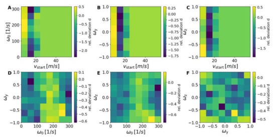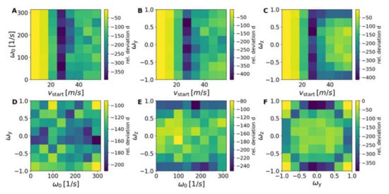 where Φ is the number of trajectories within the four-dimensional bin with the coordinates (i, j, k, l) of the histogram; Φ is an abbreviation for Φi,j,k,l. Two dimensions from vstart, ω0, ωy, and ωz were selected for the plots denoted by i and j, whereas the relative deviation was summed up over the remaining dimensions, k and l. In order to account only statistically sensible data, differences in the numerator less than 10 were neglected. Plots were then generated with the Python packages Matplotlib [] and HoloViews [].